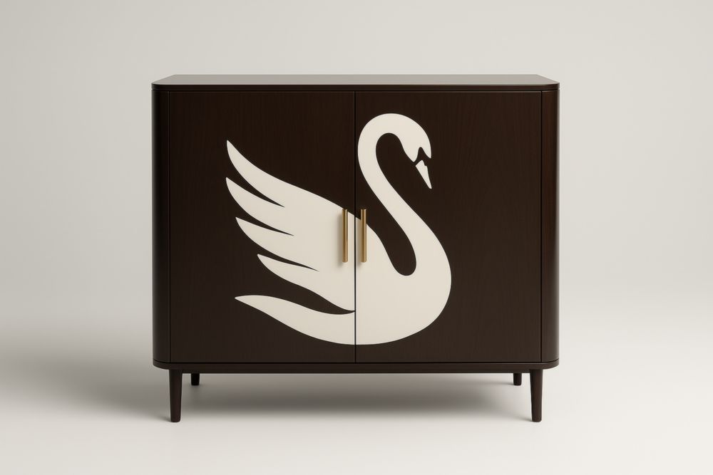 Credenza in Legno Scuro con Motivo Cigno Bianco